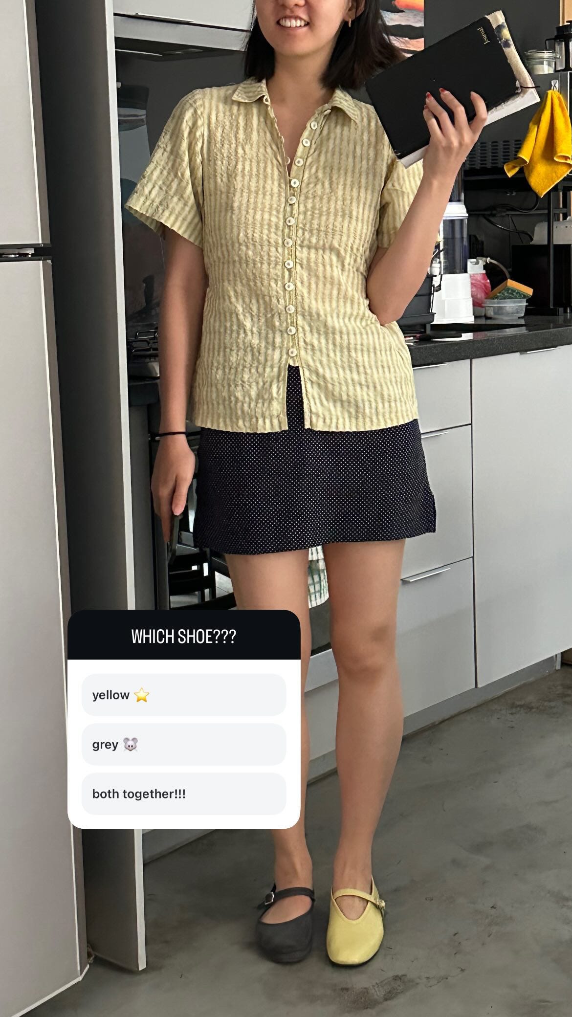 I had trouble deciding which shoes to wear with this outfit, with one matching the top and one matching the bottom. This is an old skirt from my mom’s closet, which I altered to fit my waist and bring the hemline way up. I decided to ask my friends, with the majority preferring the yellow!